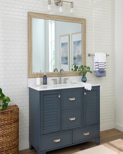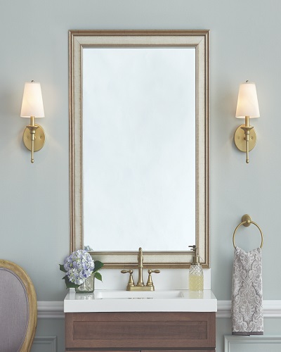 Coordinate your frame with existing elements like faucets, cabinet handles, and light fixtures for a cohesive look.